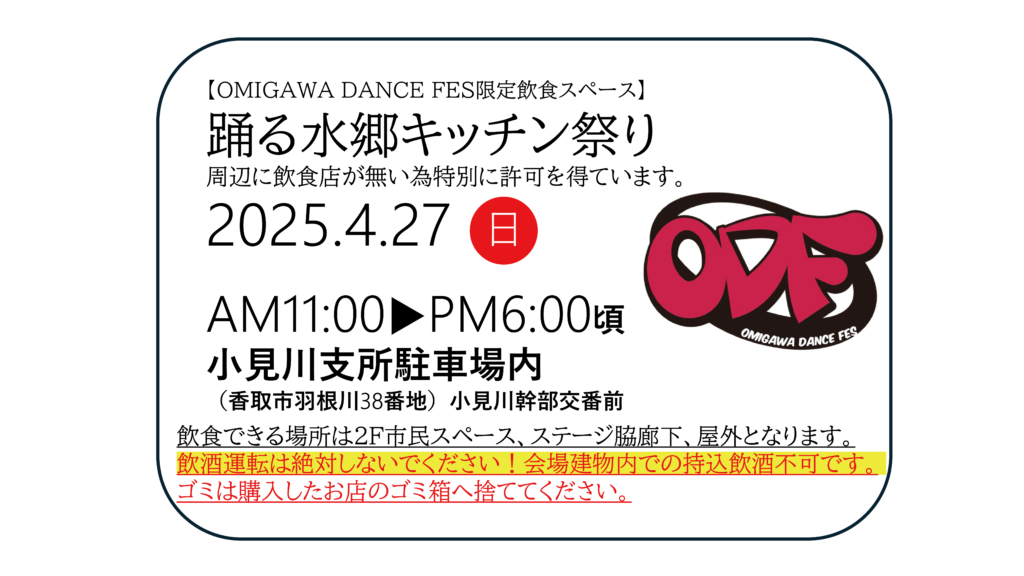ODF OMIGAWA DANCE FES 2025 & 踊る水郷キッチン祭り Pizzeria Oasi サニーズ成田店 AND RIVER 串焼きたんたん SILVER with LOTUS たこ焼き上々 MERRY CAFE 水郷のとりやさん 伊能忠次郎商店 DANFFLE